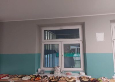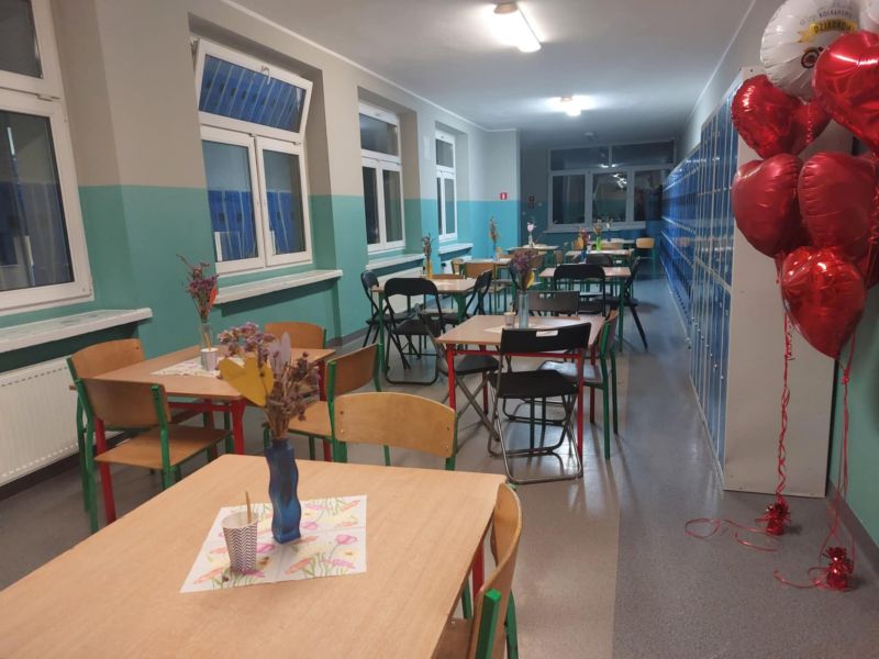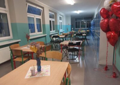 Z kolei szkolny korytarz, dzięki ogromnemu zaangażowaniu rodziców, przeobraził się w przytulną kawiarenkę, w której mogliśmy ugościć przybyłych dziadków. Klasa 1a zabrała zgromadzonych do „Magicznego sklepu z prezentami”, przedstawiając pomysły na wyjątkowe upominki dla Babci i Dziadka. Natomiast klasa 1d podczas swojego przedstawienia „podglądała” przez lornetki co w ciągu dnia robią ich dziadkowie.