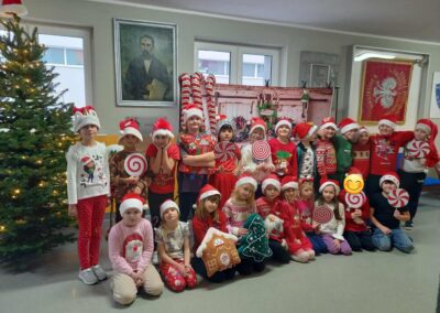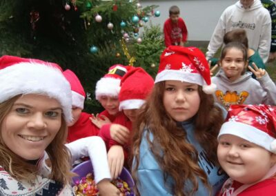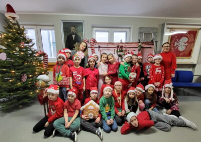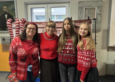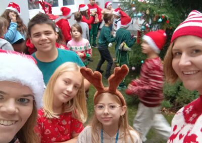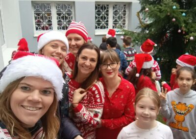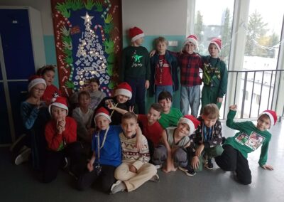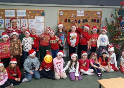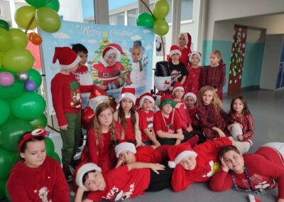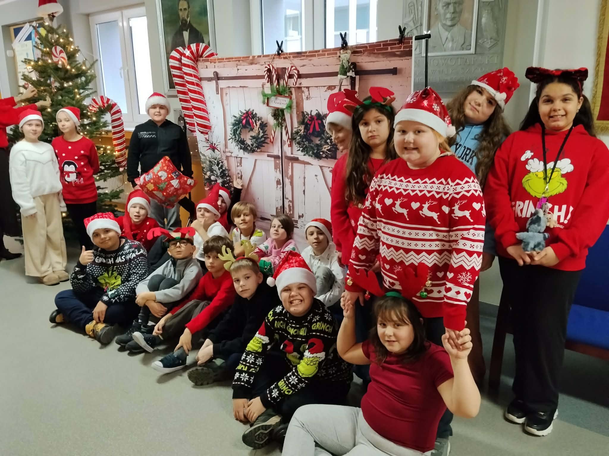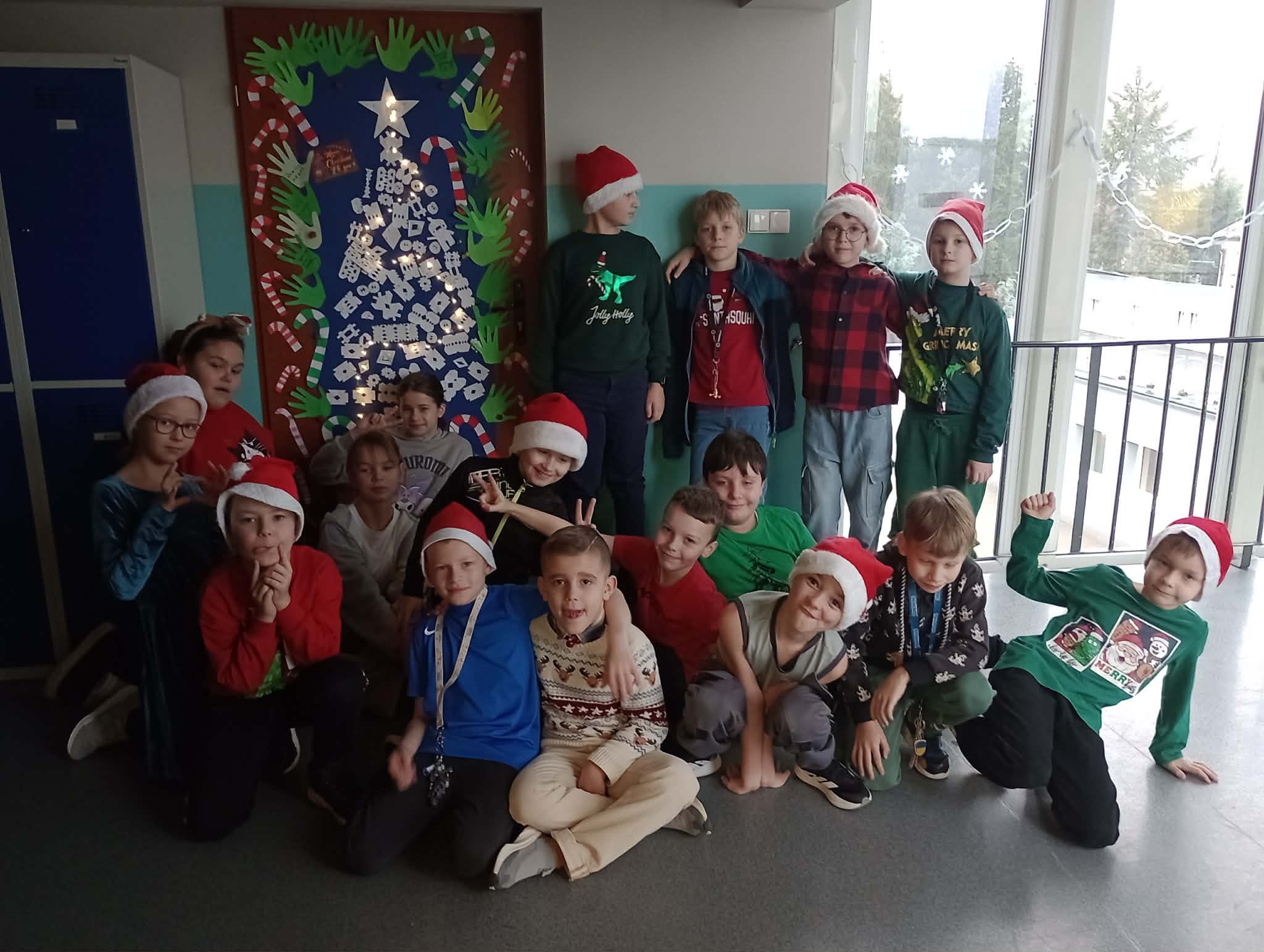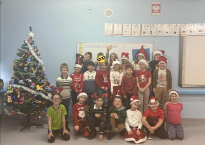Uczniowie klas 1–3 wraz z wychowawczyniami świętowali Mikołajki na wiele radosnych i pomysłowych sposobów. Każda klasa miała swoją wyjątkową formę obchodów – wspólnie ubierano choinkę, uczestniczono w seansie kinowym, odbywały się zajęcia tematyczne oraz wspólne śpiewanie piosenek świątecznych. Tego dnia nie zabrakło także wyjątkowej, świątecznej atmosfery, o którą zadbali sami uczniowie – wszyscy byli ubrani na czerwono lub w stroje z motywem świątecznym.